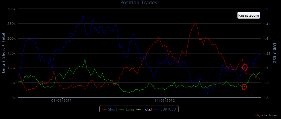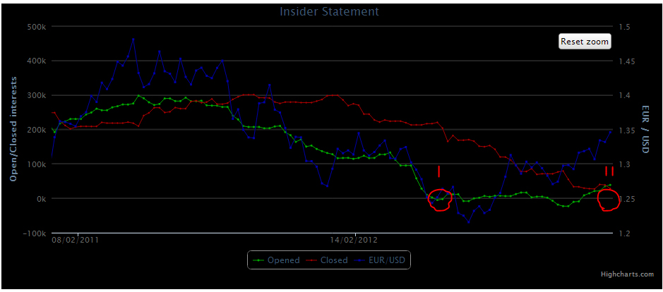 Da questo indicatore capiamo che dal 20/11/2012 (cerchiato in rosso su entrambi i grafici), gli interessi dei grossi investitori istituzionali è aperto verso il rialzo dell’Eur/Usd, visto l’incremento dei contratti long e il decremento dei contratti short.