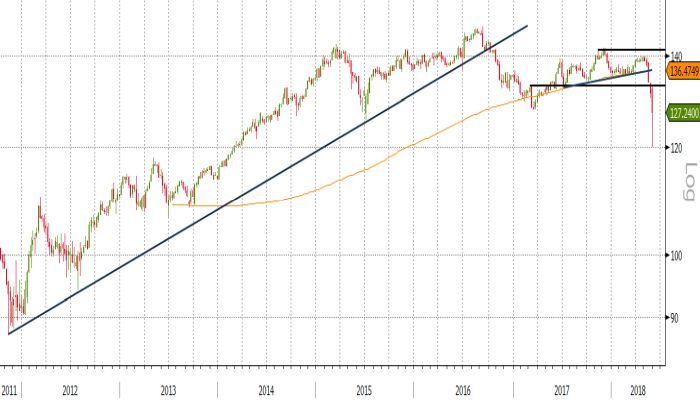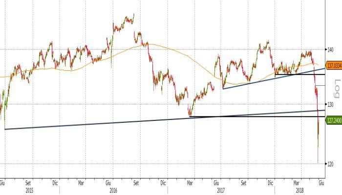 Un altro elemento resistenziale, ancor più importante guardando l’evoluzione della serie storica dei prezzi del BTP, è rappresentato dal transito in prossimità di area 128,90 delle resistenze dinamiche 29 giugno 2015 e 17 marzo 2017. Trattandosi di una linea di tendenza di lungo periodo, la violazione al ribasso del 29 maggio risulta particolarmente significativa.