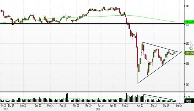 Sul fronte opposto, invece, il supporto a 125 euro potrebbe attrarre le quotazioni qualora dovesse cedere la base inferiore del triangolo, ovvero il supporto dinamico tracciato con i minimi crescenti di maggio e giugno. Per entrare si può considerare short a 128 euro con stop loss stretto a 128,5 euro.