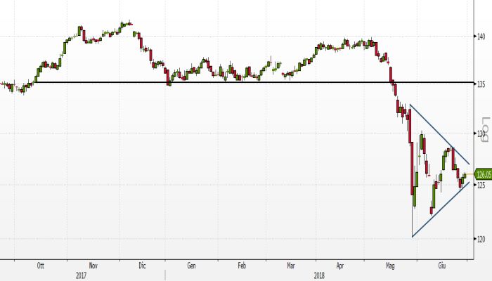 Sul grafico daily sembra che con la contrazione di volatilità vista nelle ultime due settimane lo strumento stia costruendo un triangolo, figura che tipicamente anticipa una prosecuzione della tendenza prevalente in atto. Dal punto di vista probabilistico dunque ora appare più concreta la possibilità che il prezzo continui a scendere. In questo senso potrebbero implementarsi strategie short sulla rottura del supporto a 125, per sfruttare l’uscita al ribasso dal triangolo descritto in figura. Questa operatività avrebbe stop loss a 128,7 e target individuabili a 123 e 120.