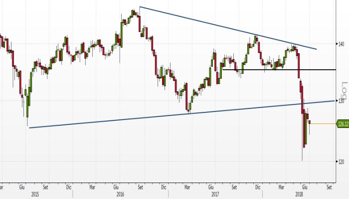Il quadro d’insieme del BTP Future rimane però incerto. La brusca discesa messa a punto a fine maggio sulla scia dell’incertezza che coinvolse la formazione del Governo ha infatti danneggiato la struttura grafica del prezzo. Il breakout più importante da questo punto di vista è stato quello del supporto a 135, livello che esprimeva il bordo inferiore del trading range entro cui le quotazioni sono state contenute per buona parte del 2017 e l’inizio del 2018.