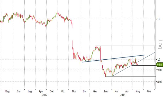 Anche se ora che il prezzo si trova sotto la resistenza statica situata in area 10 euro, il gap down che copre la zona tra 13,75 e 12,09 potrebbe ingolosire intenzioni long, l’impostazione di lungo resta ribassista. L’arresto subito dal titolo in queste ultime sedute potrebbe dunque esser sfruttato per costruire un’operazione di ribasso con punto d’ingresso individuabile a 9,70 euro e stop loss a 11 euro. Target primario di questa strategia situato a 7 euro e obiettivo finale a 6 euro.