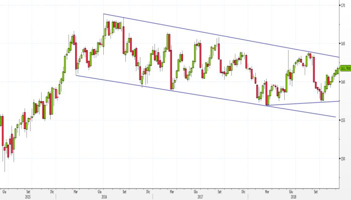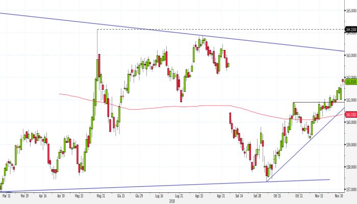 Le quotazioni del Bund future al momento si attestano a 161,83 euro dopo l’apertura in gap up. Nel breve termine il derivato sul decennale tedesco, oltre a violare al rialzo la resistenza che conta il massimo segnato nella seduta del 26 ottobre scorso a 160,90 punti, rimane stabilmente al di sopra della media mobile a 50 periodi denotando una ripresa più generale anche di lungo periodo.