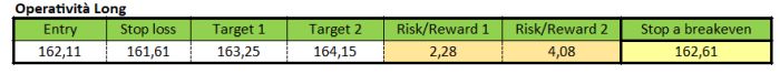 Alla luce della struttura rialzista di breve termine si potrebbero privilegiare operazioni di natura rialzista sul decennale teutonico. In particolare la rottura del livello statico a 162,11 punti fornirebbe un segnale long che avrebbe come primo obiettivo la trendline discendente di lungo periodo che rappresenta la parte superiore del canale discendente, ora transitante a 163,25 punti, mentre un target finale potrebbe essere identificato a 164,15 punti, livello resistenziale lasciato in eredità dal massimo segnato nella seduta del 29 maggio.