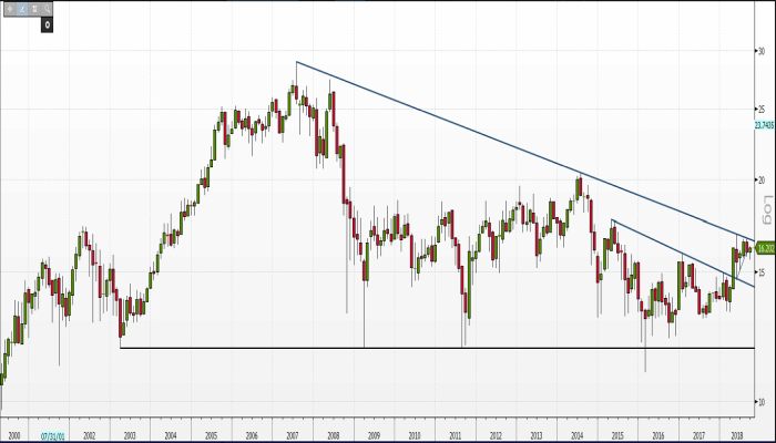 Sul grafico mensile, effettuando quindi un’analisi di lungo periodo sull’azienda del cane a sei zampe, si nota come dal 2007 i corsi siano in una fase lateral-ribassista, con la trendline che collega i massimi di luglio 2007 a quelli del luglio 2014 a fare da ostacolo invalicabile. Le quotazioni sono ora al test di detta resistenza ed è interessante notare come ci si è arrivati questa volta.