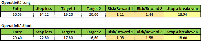 Visto quanto emerso dall’analisi tecnica del titolo si potrebbe sfruttare questa fase di consolidamento per cercare di adottare strategie di matrice rialzista con punto di entrata individuabile a 16,53 euro. Tale tipo di operatività avrebbe stop loss da porre sotto area 14,12 euro e obiettivo principale a 19,20 euro. Un potenziale obiettivo finale sarebbe appunto quota 20 euro.