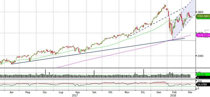 In caso di prolungata debolezza tuttavia le quotazioni potrebbero arretrare sotto i supporti a 2.700 punti. Questo eventuale breakout vanificherebbe gli sforzi profusi dall’indice a cavallo fra il 9 febbraio ed oggi, sostenuti dal punto di vista tecnico dalla trendline tracciata con i low del 9 e 2 marzo.