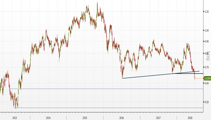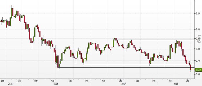 La candela settimanale in costruzione sul weekly chart di Telecom Italia rappresenta l’estensione del movimento ribassista partito ad aprile dopo il mancato breakout della coriacea resistenza statica a 0,8855 euro. Detto movimento è stato molto veloce e direzionale, caratterizzato da una forte angolazione. Pertanto il brakout dei supporti di area 0,70 euro e della trendline di sostegno tracciata con i low del giugno 2016 e novembre 2017 si configura come molto significativo.