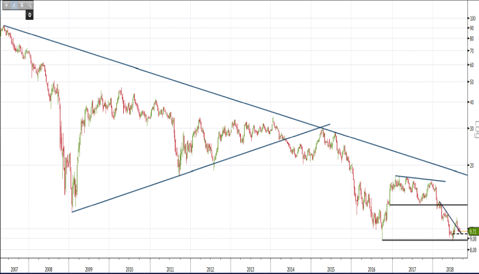 Dal punto di vista operativo l’eventuale presa di respiro delle quotazioni esposta nei precedenti paragrafi potrebbe essere occasione per prendere parte al trend ribassista di lunghissimo periodo.