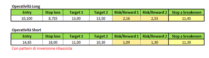 Visto quanto emerso dall’analisi tecnica del titolo, si potrebbero adottare strategie di matrice rialzista che abbiano punto di entrata localizzato a 10,10 euro. Tale tipo di operatività avrebbe stop loss posto sotto i minimi storici, a 8,755 euro, obiettivo principale a 13 euro e obiettivo finale a 13,50 euro.