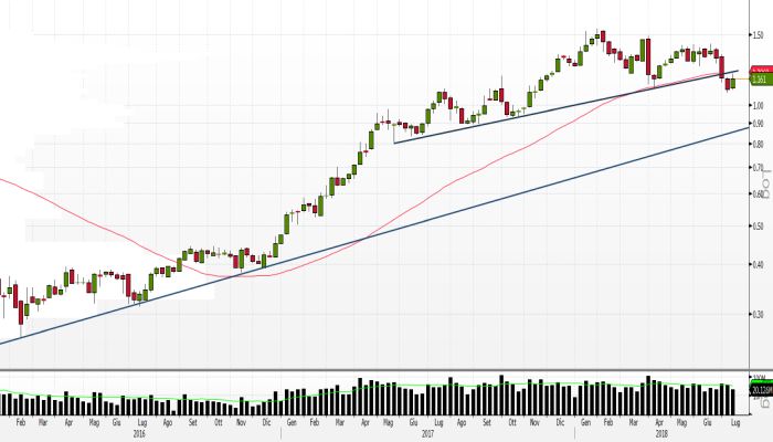 Infatti solo sopra 1,4 euro il titolo andrebbe a violare la linea di tendenza discendente fatta partire dai massimi storici del 26 gennaio 2018 e così interrompere la serie dei tre massimi decrescenti messa in fila nel primo semestre dell’anno.