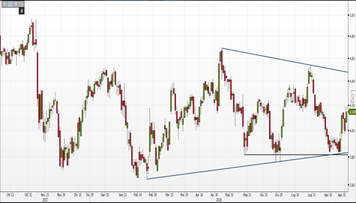 Ora i corsi parrebbero intenzionati ad effettuare un test di 4,46 euro, dove transita la trendline disegnata con i massimi dell’8 maggio e quelli del 30 luglio 2018. Questa prova è di fondamentale importanza grafica: se infatti le quotazioni dovessero riuscire a valicare la resistenza, potrebbero raggiungere area 4,68 euro dove si trova il gap down dell’8 novembre 2017.