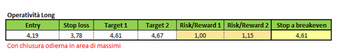 Visto quanto emerso dall’analisi tecnica dell’azione, si potrebbe privilegiare un’operatività di matrice rialzista. Si potrebbe quindi adottare un tipo di strategia che preveda punto di entrata al superamento dei massimi odierni (attualmente posti a 4,194 euro) in caso di candela di forza, avrebbe stop loss a 3,78 euro, obiettivo principale a 4,61 euro e obiettivo finale a 4,67 euro.