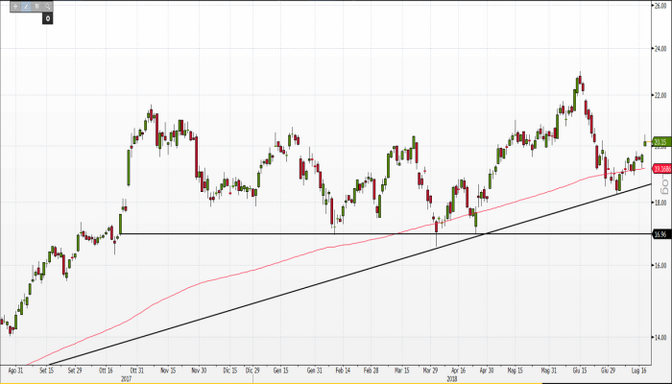 Con la seduta di oggi si potrà capire anche la validità della base del rimbalzo partito il 4 luglio scorso con un test della linea di tendenza tracciata collegando i minimi del 4 gennaio 2017 a 9,86 euro con quelli del 4 aprile 2018 a 16,565 euro.
