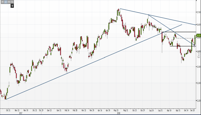 I prezzi sembrano ora diretti verso la resistenza posta a 15,40 euro che, se venisse rotta, aprirebbe nuovi scenari rialzisti con target minimi posti in area 16 euro. Se anche quest’area dovesse poi venire violata, ecco che si avrebbero ottime possibilità per le quotazioni di concludere la serie di minimi decrescenti che caratterizza il titolo dallo scorso maggio.