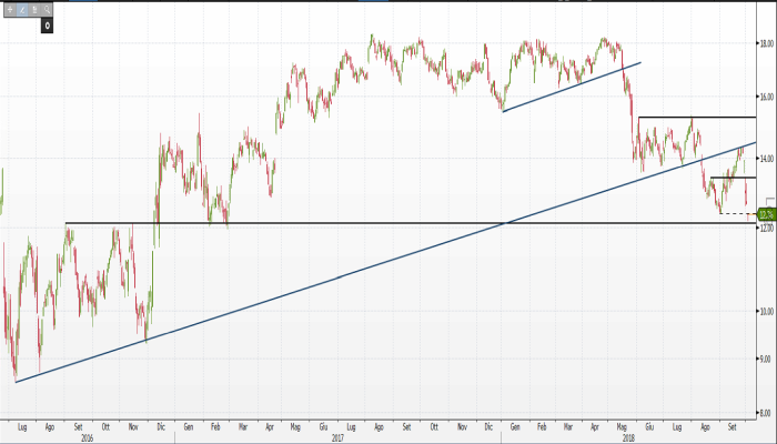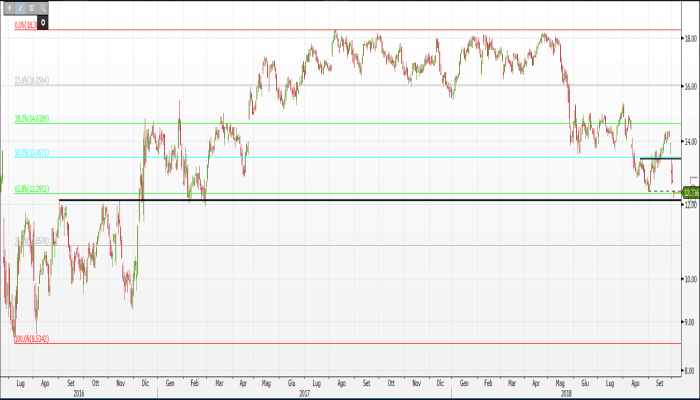 I prezzi in queste ore dovranno verificare la tenuta di un duplice supporto a quota 12,1072 euro: il primo fornito dai massimi del primo settembre 2016 e il secondo corrispondente al 61,8% di Fibonacci del movimento con minimo al 7 luglio 2016 e massimo al 7 agosto 2017. Questo doppio livello potrebbe offrire alle quotazioni l’opportunità di placare la sete di vendite del fronte ribassista. Se invece questi livelli venissero rotti, ci si potrebbe attendere un nuovo sell-off per l’istituto di credito, che verrebbe piegato dalle vendite.