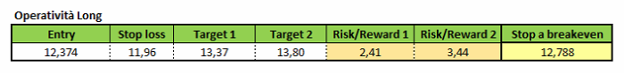 Se durante la giornata di domani i corsi andassero ad effettuare il breakout dei massimi odierni, si potrebbe azzardare un’operazione di matrice rialzista con punto di entrata a 12,374 euro (massimi odierni), stop loss a 11,96 euro, obiettivo principale a 13,37 euro e obiettivo finale a 13,80 euro. I prezzi potrebbero infatti venire calamitati dai 3 gap lasciati aperti dalle scorse sedute.