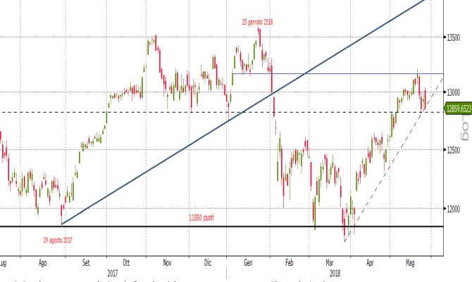Per una vendita allo scoperto potrebbe valutarsi l’apertura della posizione a 13mila punti con stop fissato inderogabilmente sui massimi del 22 maggio a 13.060 punti. Primo obiettivo a 12.825 e successivo a 12.615 punti.