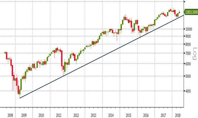 Osservando il grafico mensile dell’indice DAX si evince che la macro tendenza rialzista espressa dal mercato dal 2009 ad oggi è ancora in essere, supportata dalla trendline rialzista disegnata con i low di marzo 2009 e settembre 2011. Da un punto di vista di medio termine, invece, la forza del mercato è stata messa in discussione già a febbraio, quando cioè le quotazioni avevano abbandonato i massimi storici a 13.596 punti (23 gennaio 2018) per ripiegare fin sotto i 12mila punti. Successivamente, è stato proprio il contatto con i supporti statici sotto 12mila punti, a 11.850 punti (livello ereditato dai minimi del 29 agosto 2017), che ha permesso agli acquirenti di rialzare la testa, almeno fino al 22 maggio scorso.