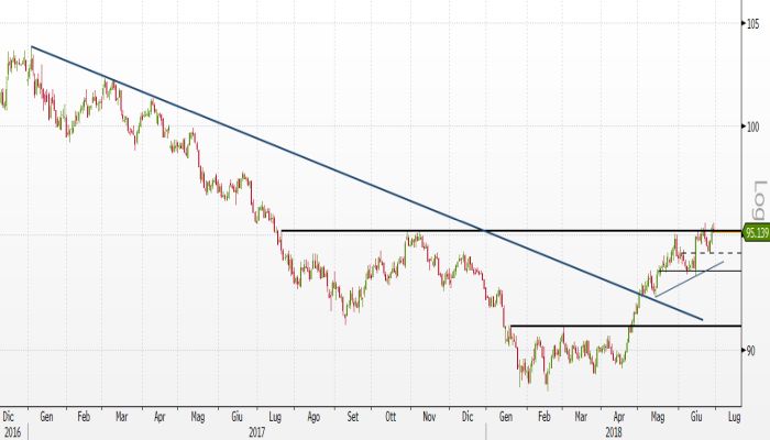 In tal senso i corsi dovrebbero però andare verso la rottura veloce dei precedenti minimi relativi a 94,171 punti segnati il 14 giugno scorso per poi riuscire a mettere in atto un decoroso ritracciamento. Se invece i prezzi dovessero prendere ulteriore forza chiudendo una candela giornaliera sopra quota 95,64 punti, avrebbero come successivo target l’ultima resistenza prima di quota 100 punti, data dall’area intorno a 97 punti.
