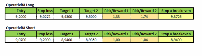 Si potrebbe dunque attendere una fuoriuscita dall’attuale zona di compressione prima di prendere una decisione a livello operativo. A tal proposito, chiusure giornaliere al di sopra di quota 9,20 (sopra i massimi della seduta di ieri, in cui i corsi sono stati respinti) qualificherebbero strategie di matrice rialzista con stop loss a 9,0274 e obiettivo principale a 9,43. L’obiettivo finale è invece identificabile a 9,50.