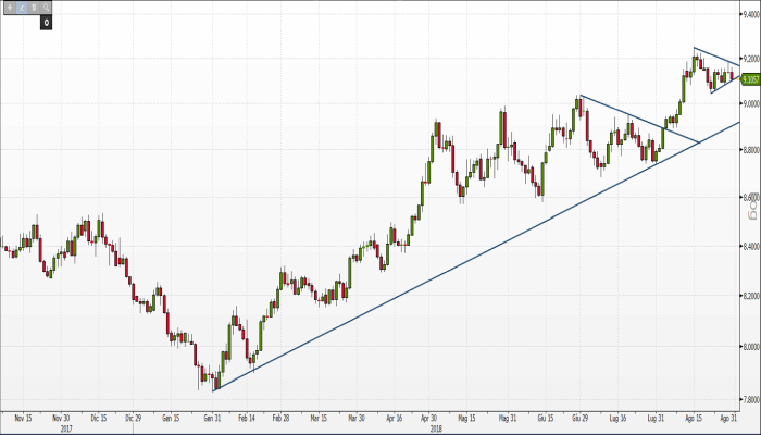 L’incertezza politica si rispecchia sul grafico del cambio USD/SEK dove le quotazioni denotano un forte trend rialzista che accompagna le quotazioni da tutto il 2018, come evidenziato dalla linea di tendenza che collega i minimi del 31 gennaio 2018 con quelli dell’1° febbraio 2018.