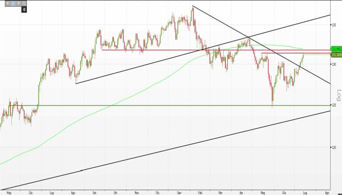 Le quotazioni ora si trovano nei pressi di una zona resistenziale molto forte data dall’area statica menzionata prima e dal passaggio a 131,945 yen della media mobile a 200 giorni che in passato ha sempre funzionato molto bene come area di reazione dei prezzi.