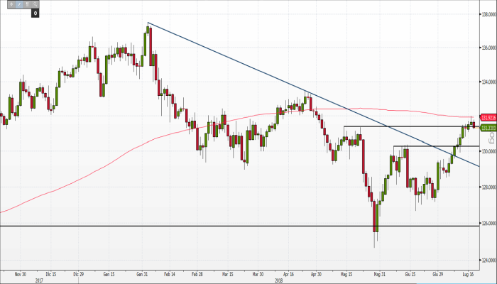 Se infatti nella seduta odierna la moneta unica dovesse perdere ancora quota contro lo yen giapponese, si formerebbe un pivot di inversione a tre punti. Se detta figura tecnica dovesse venire confermata, potrebbe portare le quotazioni in primis verso i supporti statici di area 130,280 yen (massimi del 7 giugno scorso) per poi passare al re-test di area 129,280 yen. Presso quest’ultimo livello il cross andrebbe ad incrociare la linea di tendenza che collega i massimi del 2 febbraio 2018 a 137,500 con quelli del 24 aprile 2018 a 133,490. Questo evento rappresenterebbe il primo vero pullback che ne andrebbe a certificare il passaggio da resistenza a supporto dinamico.