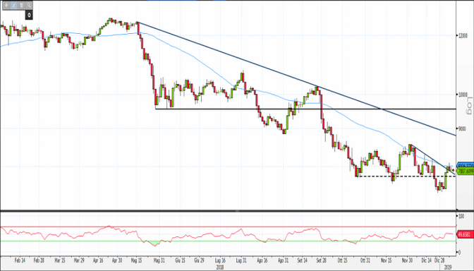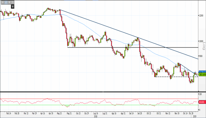 Graficamente, i corsi sono in difficoltà a ridosso della media mobile a 50 giorni, che li ha fatti retrocedere dopo aver effettuato la rottura della linea di tendenza di breve periodo, che collega i massimi del 4 a quelli del 13 dicembre 2018. Il transito dell’algoritmo corrisponde inoltre alla soglia psicologica degli 8.000 punti, fattore che ne accresce la validità come elemento resistenziale.