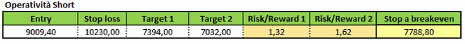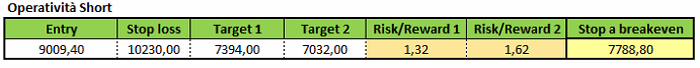 In tal caso, il primo punto si potrebbe collocare a 8.565,19 punti, il secondo a 8.913 punti e il terzo a 9.550 punti, per un prezzo medio di carico a 9009,40 punti. Se tutti i punti di entrata venissero soddisfatti, lo stop loss potrebbe essere localizzato a 10.230 punti, mentre l’obiettivo principale a 7.394 punti. Un obiettivo più ambizioso si potrebbe invece inserire in area 7.032 punti.