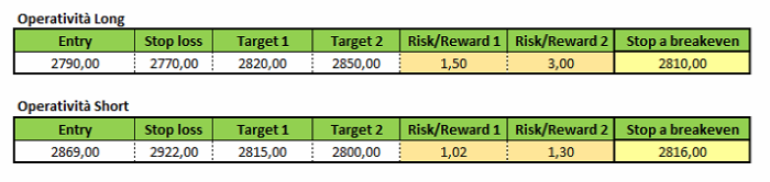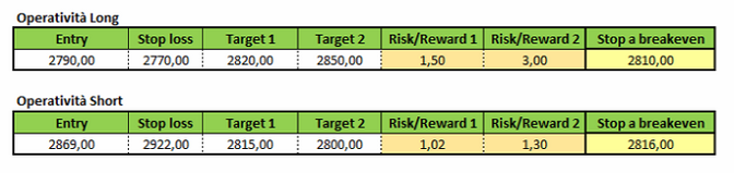 Tale ritracciamento potrebbe essere sfruttato poi per entrate long con punto di entrata localizzato in area 2.790 punti, stop loss a 2.770 punti e obiettivo principale a 2.820 punti. L’obiettivo finale in questo caso si potrebbe trovare a 2.850 punti.