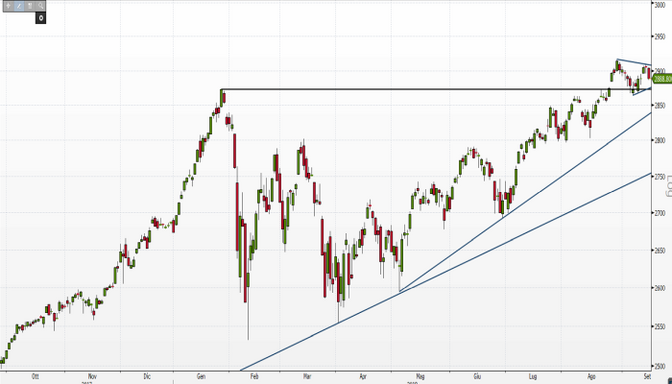 Questo segnale, unito alla struttura delle scorse sedute e alla guerra dei dazi, potrebbe essere un avviso che stiano per cominciare alcune prese di profitto. Se si uniscono i massimi del 29 agosto con quelli del 14 settembre e i minimi del 7 con quelli dell’11 settembre 2018 si otterrà una figura di compressione triangolare che imprigiona i corsi.