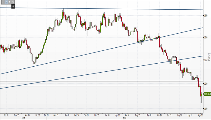 Tale eventuale voglia di rimbalzo si potrebbe protrarre fino a quota 1.221,17 dollari l’oncia, area ove si arriverebbe a completare il test della nuova zona resistenziale lasciata in eredità dalla congestione che ha caratterizzato le quotazioni a cavallo tra il 2 e il 10 agosto scorso. Da quel livello i corsi del gold potrebbero infatti riprendere a scendere ed estendere le perdite fino ad area 1.122,89 dollari, supporto fornito dai minimi del 15 dicembre 2016.