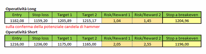 Operativamente, per chi volesse adottare strategia di matrice rialzista dovrebbe attendere la chiusura odierna per verificare se la potenziale candela di Hammer verrà confermata. Se così dovesse essere, si potrebbero effettuare dei long al superamento del massimo odierno (posto al momento della scrittura a 1.182,08 dollari) che abbiano come eventuale stop loss area 1.159,20 dollari, come obiettivo principale 1.205,89 dollari e come obiettivo finale area 1.215,17 dollari.