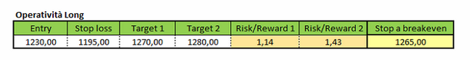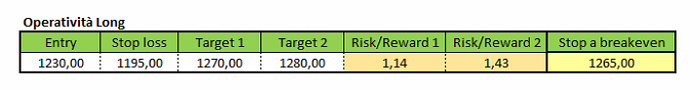 L’oro potrebbe essere quindi giunto ad un punto di svolta, occorre però un recupero dei 1.230 dollari per far si che i corsi possano effettuare una ripresa seria. Tale recupero inoltre qualificherebbe un pattern di inversione rialzista denominato rounding bottom. Tale potenziale rimbalzo inoltre, se confermato, sarebbe foriero di interessanti operazioni con un buon rapporto di rischio rendimento.