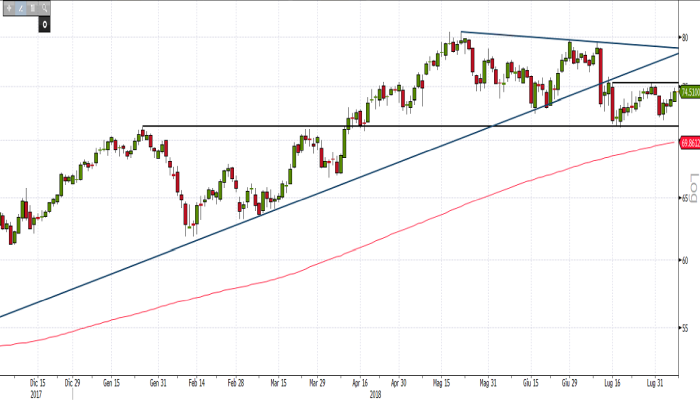 Se invece tale livello dovesse nuovamente respingere le quotazioni si potrebbe assistere ad un ritorno dei prezzi verso i supporti di 71,28 dollari che se rotti porterebbero le quotazioni del Brent verso il successivo supporto dato dalla media mobile a 200 giorni, ora transitante a 69 dollari.