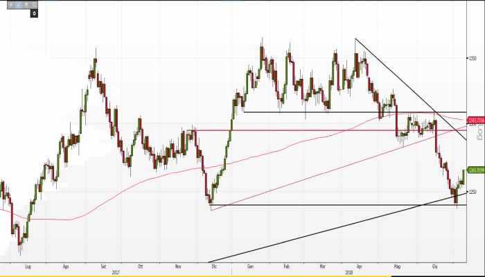 L’oro è reduce da un importante trend ribassista di medio periodo che ha interessato i corsi dall’ultima settimana di aprile fino a fine giugno. In questo lasso temporale le quotazioni sono passate dai massimi relativi sopra i 1.350 dollari ai minimi toccati in area 1.240 dollari, in corrispondenza di un importante supporto statico ereditato dai minimi dell’11 dicembre 2017.