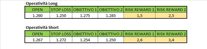 Da quanto emerso dall’analisi, si potrebbero effettuare operazioni long al raggiungimento di quota 1.260 dollari con stop loss a 1.250 dollari e obiettivo intermedio in zona 1.275 dollari. L’obiettivo finale potrebbe essere ragionevolmente posto in area 1.285 dollari. Sul fronte ribassista invece si fanno interessanti strategie short aperte a 1.267 dollari con obiettivi a 1.254 e 1.250 dollari e stop loss a 1.272 dollari.
