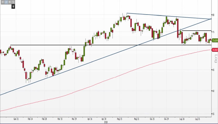 Occorre però un recupero di quota 75,37 dollari in primis, resistenza dovuta ai massimi del 16 luglio 2018 e che si è rivelata zoccolo duro del fronte ribassista; il secondo ostacolo che dovrà affrontare il fronte rialzista nel caso volesse mettere in piedi un movimento che punti alla ripartenza delle quotazioni dell’oro nero è dato da 78,50 dollari, dove incontrerebbe la linea di tendenza che collega i massimi del 22 maggio 2018 a 80,49 dollari con quelli del 29 giugno scorso a 79,70 dollari e quella che collega i minimi del 21 giugno 2017 a 44,35 dollari con quelli dell’8 marzo 2018 a 63,43 dollari.