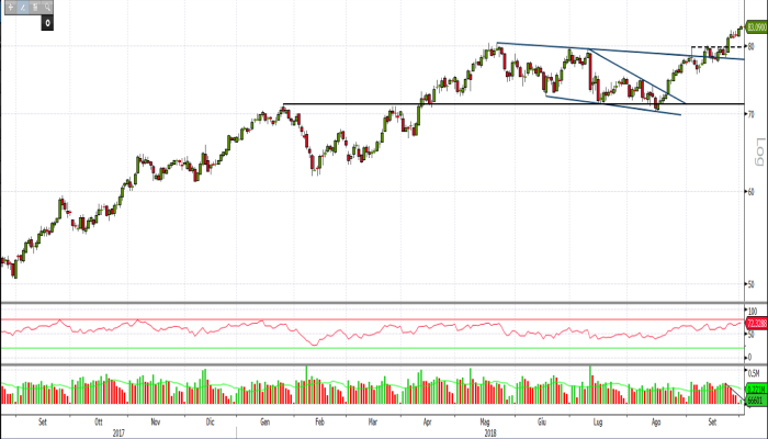 Affiancando a tale analisi quella algoritmica, eseguita in questo caso con l’ausilio di un RSI a 14 periodi e bande di oscillazione settate inferiormente a 20 e superiormente a 80, si nota che l’andamento dell’oscillatore si sta gradualmente avvicinando alla soglia di Ipercomprato.