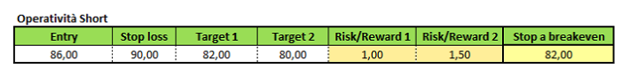 Tali figure potrebbero iniziare a comparire nell’intorno degli 85-87 dollari al barile, momento in cui si paleserà l’effettivo eccesso dell’oscillatore. Queste strategie avrebbero stop loss da porsi sopra i 90 dollari, obiettivo principale a 82 dollari e obiettivo finale a 80 dollari al barile, dove i corsi si troveranno ad effettuare il re-test delle ex resistenze statiche.