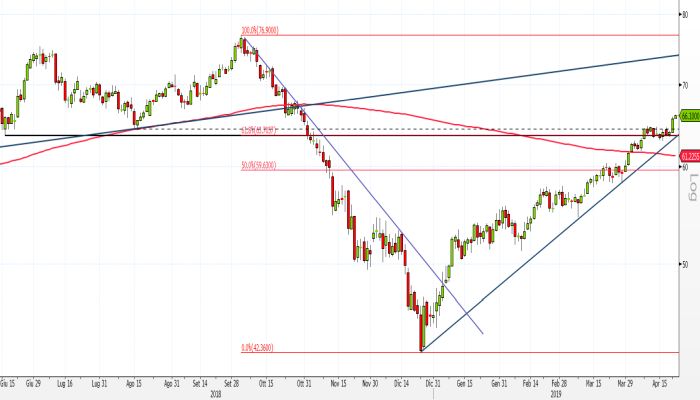 L’area di prezzi appena abbandonata è infatti lasciata in eredità dai due minimi segnati a giugno e agosto 2018, rispettivamente a 63,59 e 64,51 dollari. Il recente impulso rialzista, quindi, oltre a confermare la struttura grafica favorevole ai compratori denota anche che gli stessi sono riusciti ad oltrepassare un duplice livello resistenziale, dal quale i venditori potevano tornare in vantaggio.