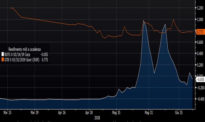 Anche sul mercato dei BOT i rendimenti si sono sensibilmente ridotti. Nel grafico possiamo notare l’andamento dei BOT italiani e greci con scadenza a marzo 2019. Sono i BOT che qualche settimana fa tanto avevano fatto parlare in quanto il rendimento del titolo italiano aveva superato per lo spazio di una singola seduta quello dell’omologo greco. Oggi vediamo che dopo il 7 e 8 giugno la forbice fra i rendimenti prezzati dai due titoli si è drasticamente allargata a favore del BOT tricolore (ISIN IT0005326597), con lo yield di quest’ultimo ritornato addirittura sotto zero.