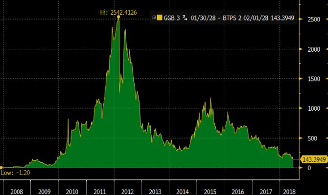 Differenziale del rendimento fra titoli a dieci anni di Italia e Grecia; fonte: Bloomberg
