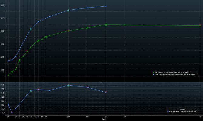 Curva dei rendimenti dei titoli di Stato di Italia e Grecia; fonte: Bloomberg