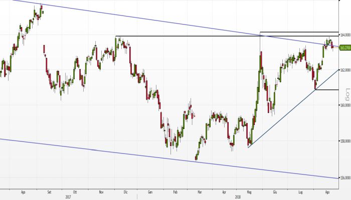 In tal senso, la falsa rottura provocata dalla serie di candele formatesi dal 15 al 20 agosto, ultimata con la candela di breakout ribassita del 21 agosto, favorisce un’operatività di tipo short, considerando che con queste candele non è stata solo provocata una falsa rottura della parte superiore di un canale discendente di lungo periodo (Flag), ma anche il rifiuto dell’area resistenziale di medio periodo delimitata dai livelli statici posti a 163,92 euro e 164,15 euro.