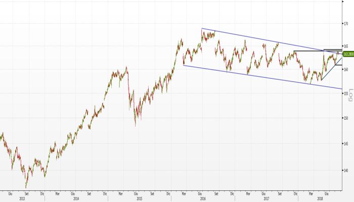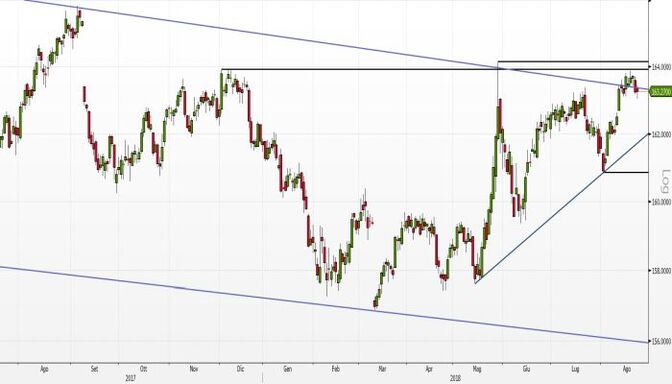 I corsi del Bund Future hanno recentemente sfiorato i massimi in area 164,15 euro con la candela del 17 agosto scorso che si è fermata su un altro livello statico importante, quello a 163,92 euro, livello molto significativo che ha respinto le quotazioni già nel mese di dicembre 2017.