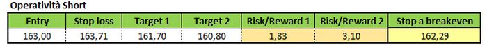 Oltre al rifiuto del livello statico a quota 163,92 è stata provocata una falsa rottura del livello dinamico di lunghissimo periodo che conta i massimi segnati: il 23 giugno 2016 a 168,86 euro, il 9 settembre 2016 a 168,42 euro, il 5 settembre 2016 a 165,83 euro e quello più recente segnato il 29 maggio scorso a 164,15 euro.