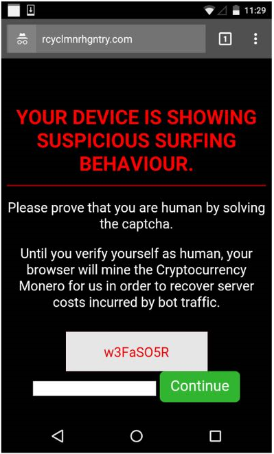 A differenza degli attacchi passati, dove i bitcoin venivano estratti tramite l’apparizione di advertising o l’istallazione occulta di determinate app sul proprio dispositivo, questo assalto di criptomining avverte direttamente l’utente che si sta per verificare un problema sul proprio dispositivo Android e che deve inserire un codice Captcha per risolvero e provare di essere un umano.