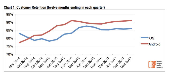 Secondo il rapporto la percentuale di fedeltà degli utenti Android è rimasta alta sin dal 2016 continuando a salire e raggiungendo, a oggi, il 91%. Un numero decisamente elevato considerando che lo stesso tasso per quanto riguarda i possessori di iPhone si stanzia tra l’85 e l’88%.